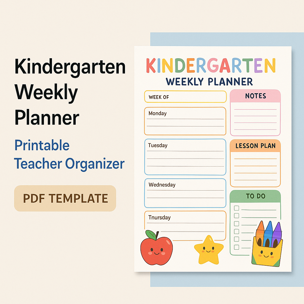 Kindergarten Weekly Planners | Colorful, visual planners designed for early childhood educators. | Weekly lesson plans with image cues, attendance sheets, parent note pages. | Sell matching alphabet/number classroom printables. |